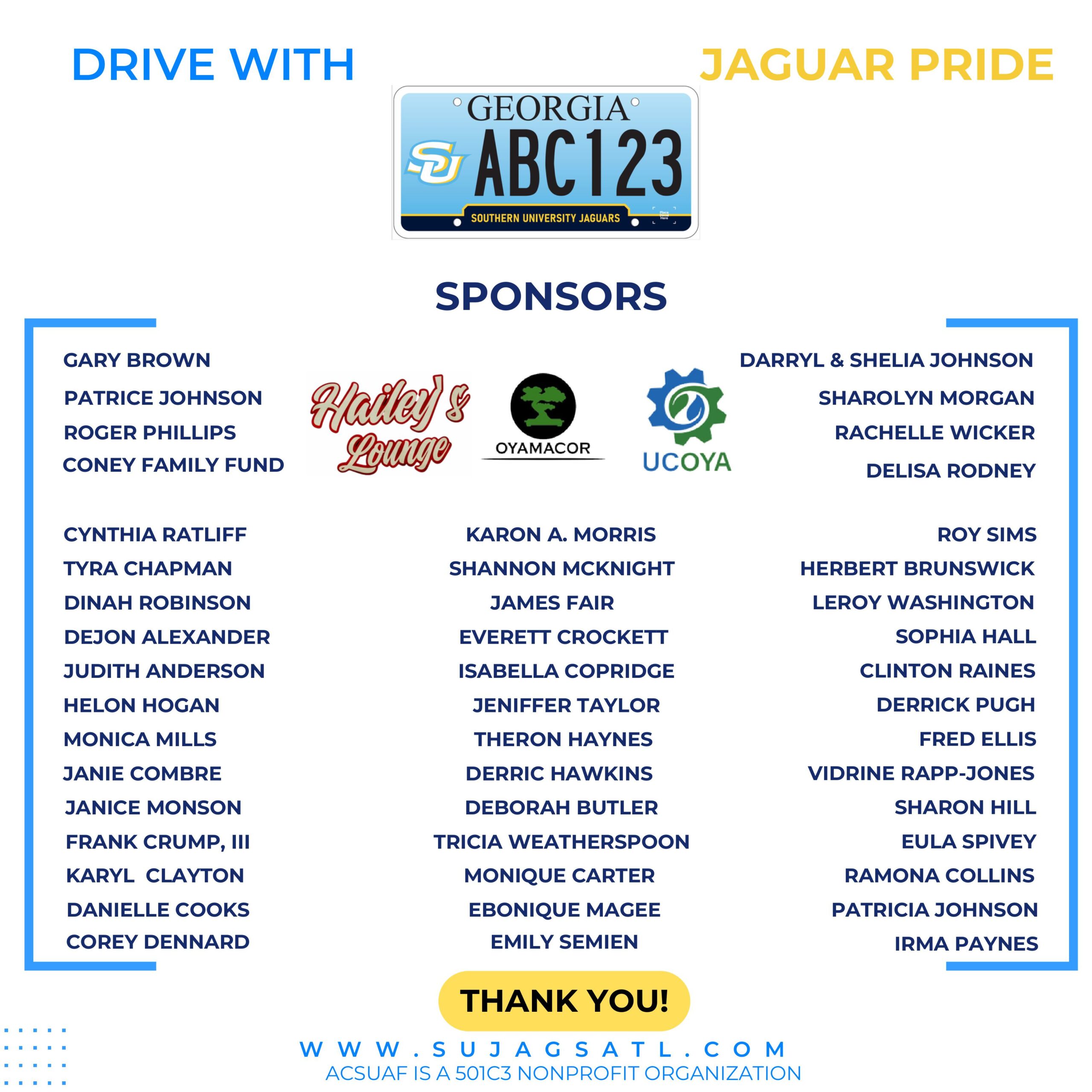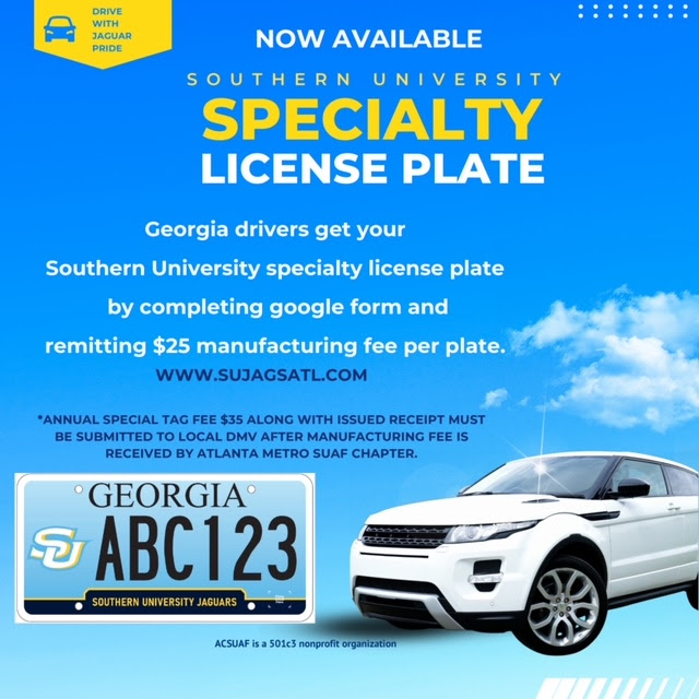 Since this is a new plate, some DMV offices may not be aware. Individuals should inform them that they are getting a sponsor tag. The Customer Service representative should refer to plate code S7-Southern University and the Letter ID provided on the letter. The $25 manufacturing fee is to be waived. Individuals should only pay for the annual $35 special tag fee plus processing fee. If it is time for your annual registration (birthday month), the $20 fee will apply.