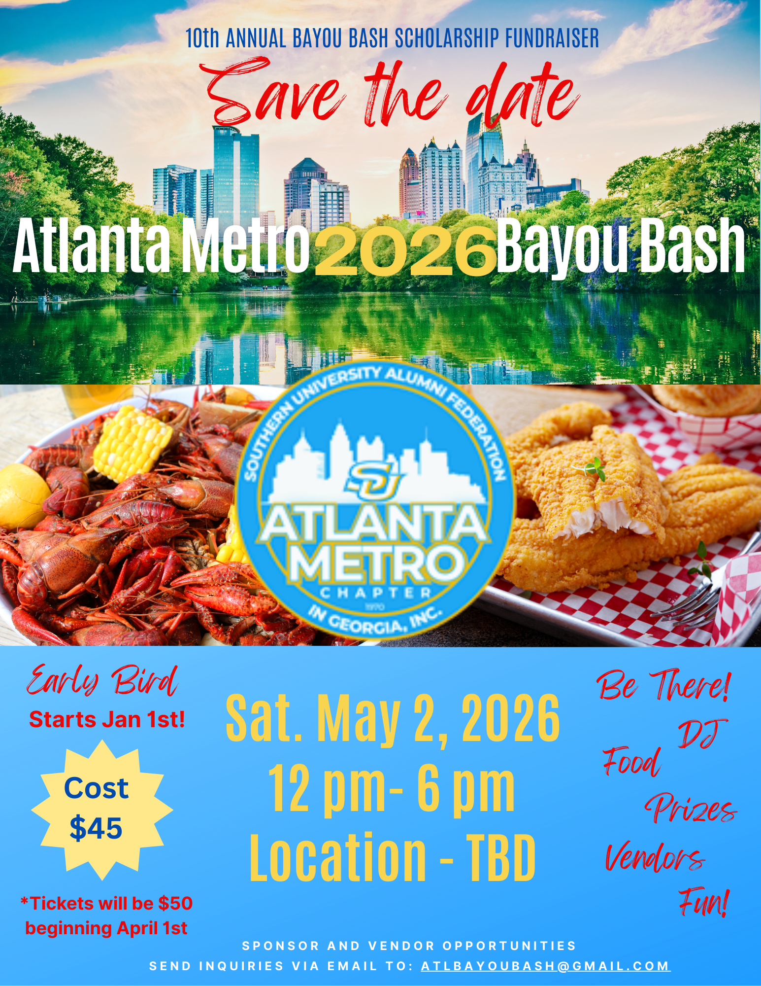 Founder’s Day National Academic Signing Day Bayou Bash* Golf Tournament* HBCU Alumni Alliance 5k Walk/Run* Atlanta Achievement Award Banquet Holiday Party in lieu of Meeting The Metro Atlanta Chapter of Southern University wish to thank you for your support.